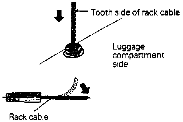 (4) Force the rack cable into the motor assembly with the tooth side facing toward the luggage compartment.