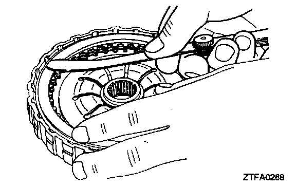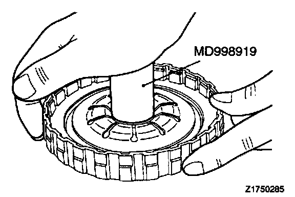 After the snap ring has been installed, check to see if the clearance between the snap ring and clutch reaction plate is up to specification. When measuring the clearance, press the entire periphery of the clutch reaction plate with a force of 50 Nm (11 lbs.). If the clearance is out of specification, reselect the snap ring to obtain the specified clearance.