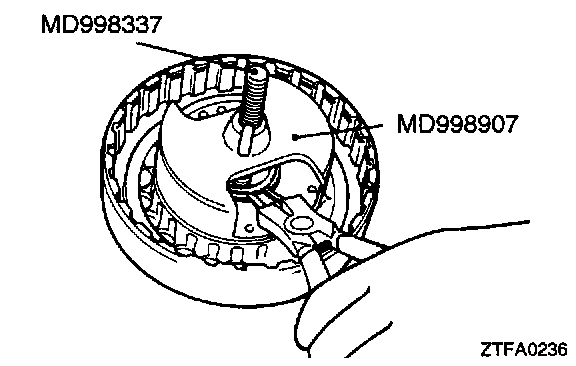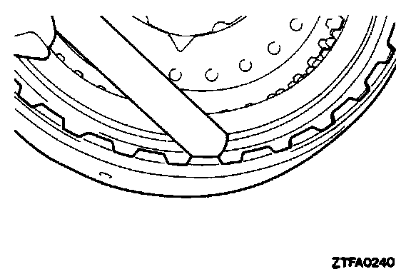 Check clearance between the snap ring and clutch reaction plate. To check the clearance, hold entire circumference of the clutch reaction plate down with 50 Nm (11 lbs.) force. If clearance is out of standard value, select a snap ring to obtain the standard value.
