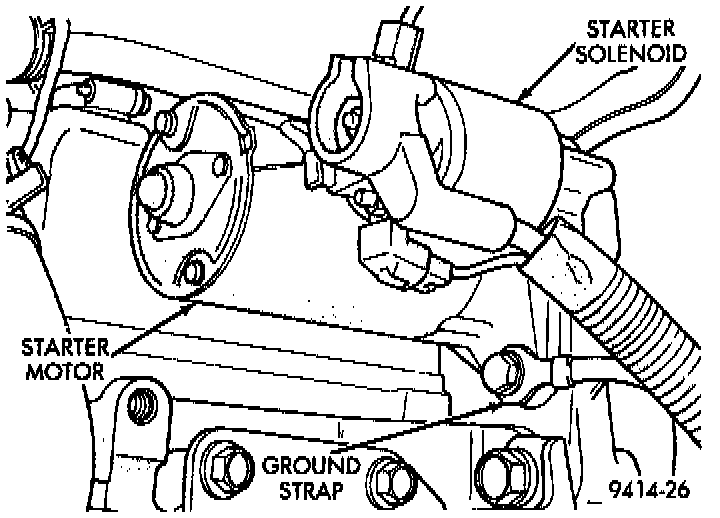 12. Inspect for corrosion on the electrical connections at the starter motor solenoid. Check the ground cable connection below the starter motor.