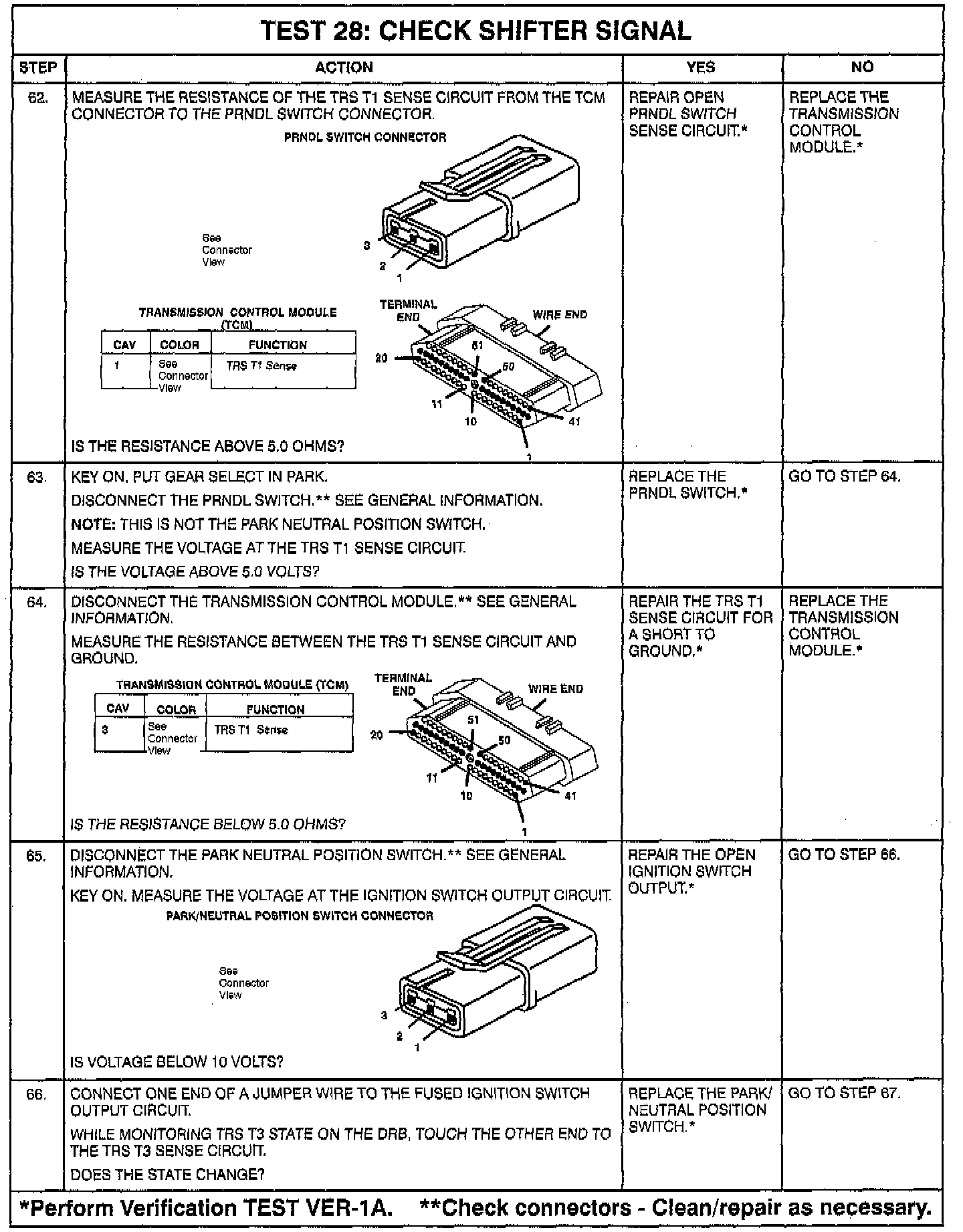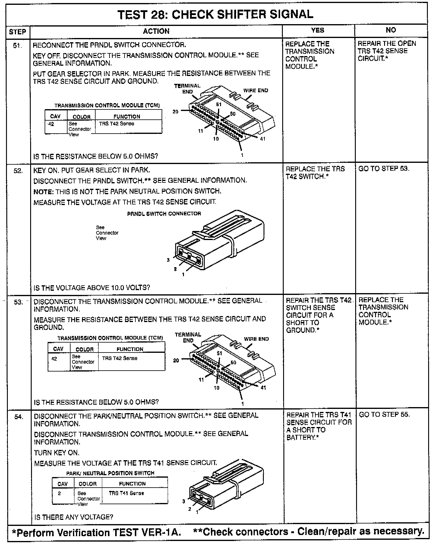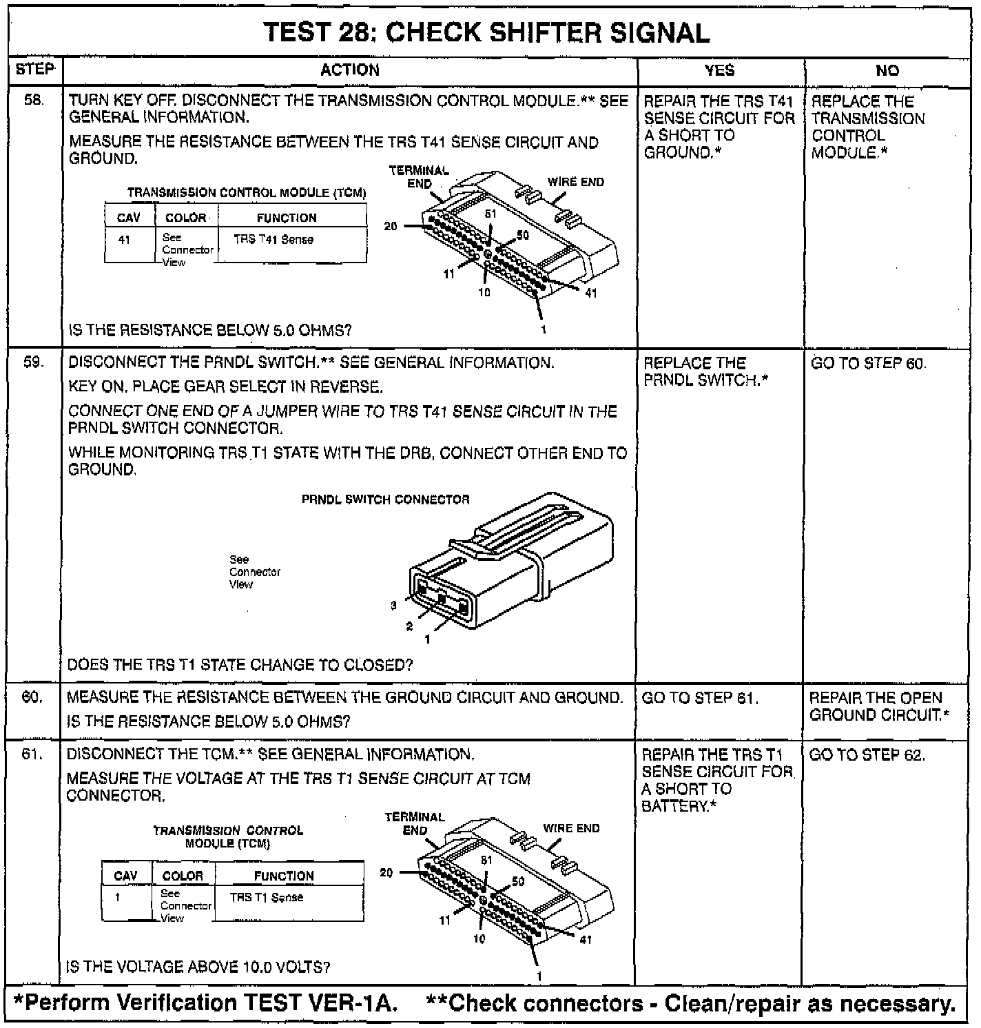 - Intermittent T1, T3, T41, T42 **circuits. Check for corrosion, terminal push-outs or spread terminals at 60-way and/or TRS, P/N, or PRNDL switch 10-way connector.