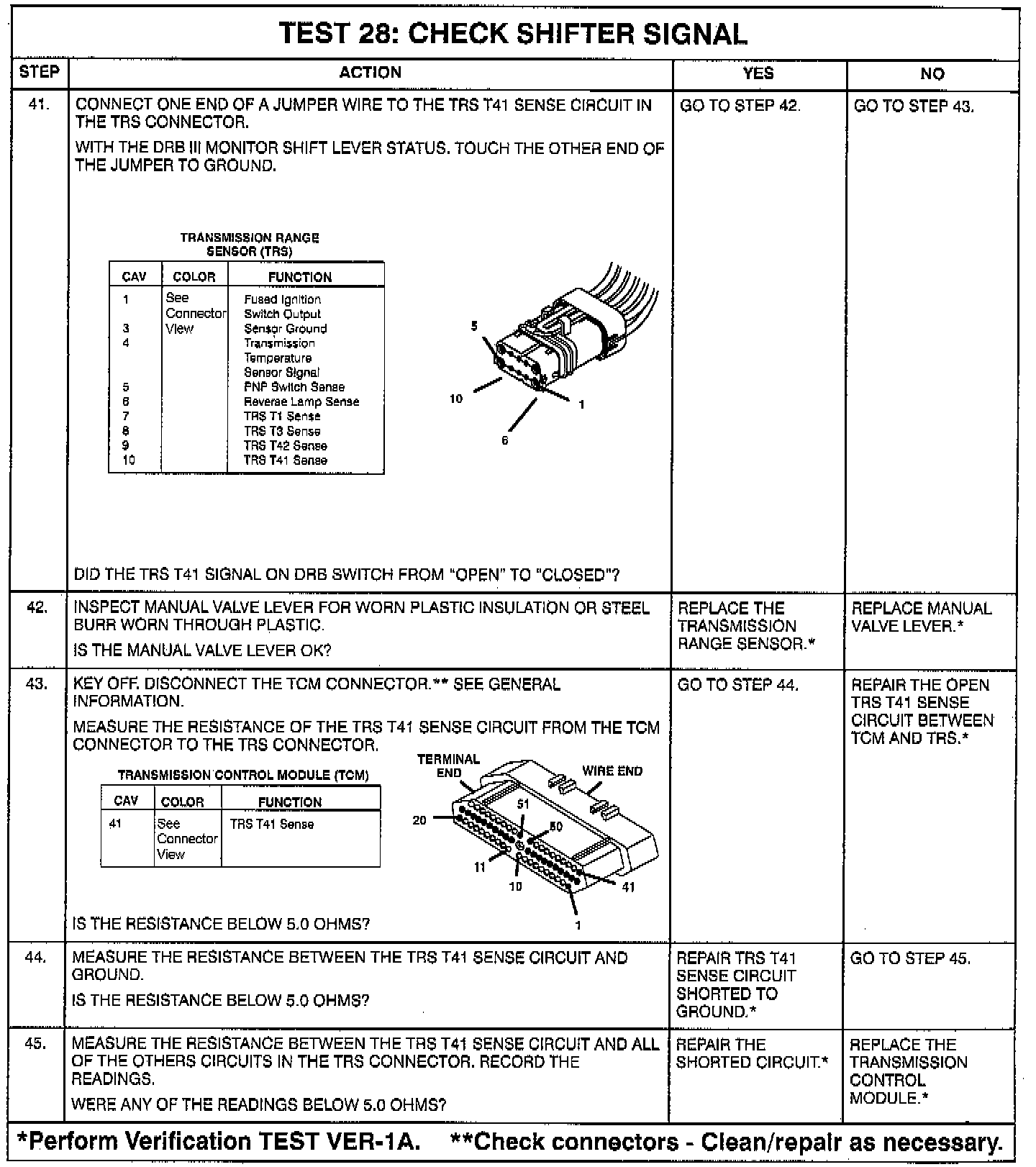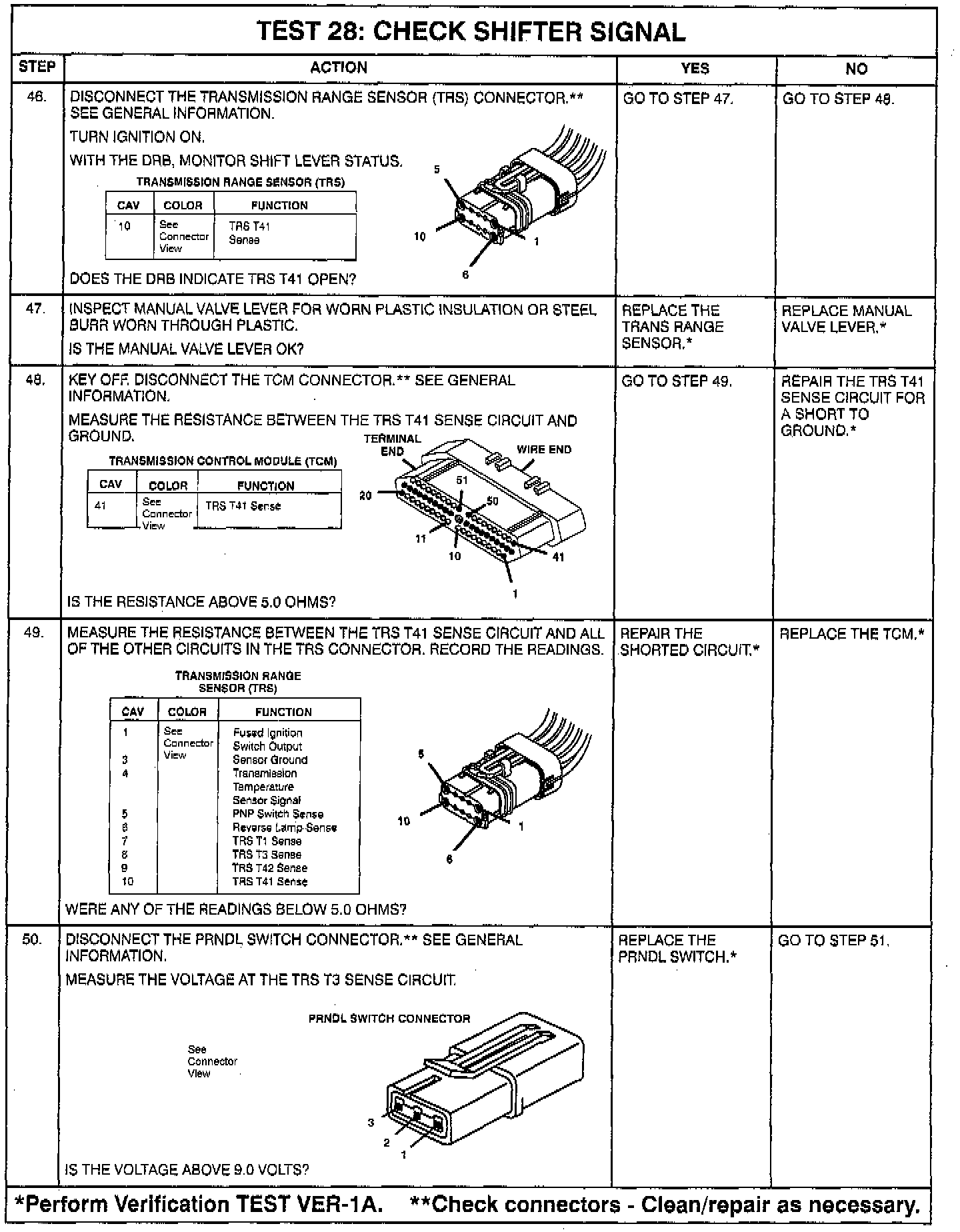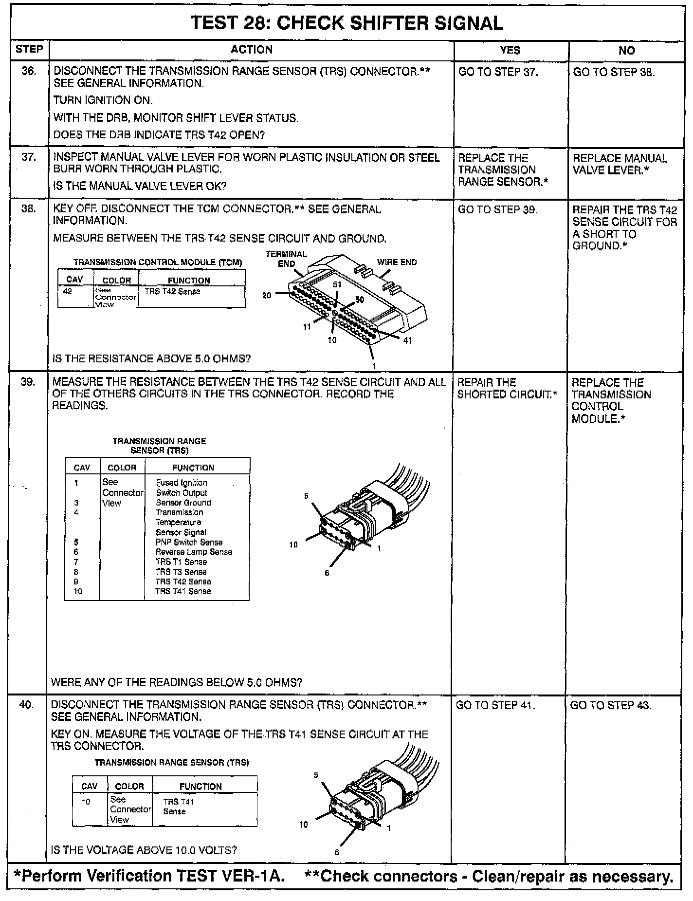 - Intermittent T1, T3, T41 or T42** circuits. Check for corrosion, terminal push-outs or spread terminals at 60-way and/or TRS, P/N, or PRNDL switch 10-way connector.