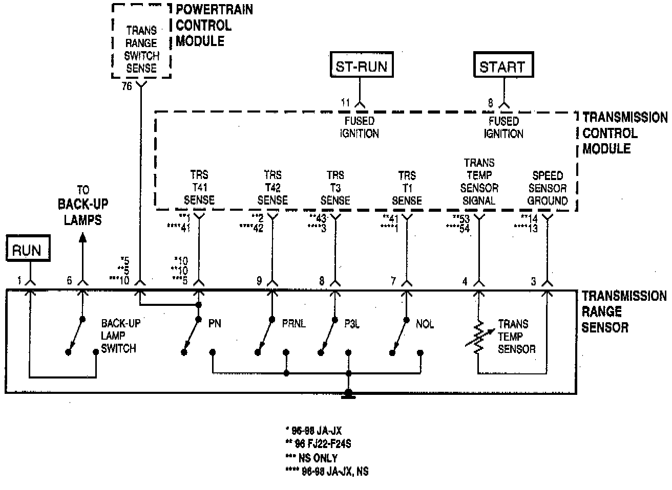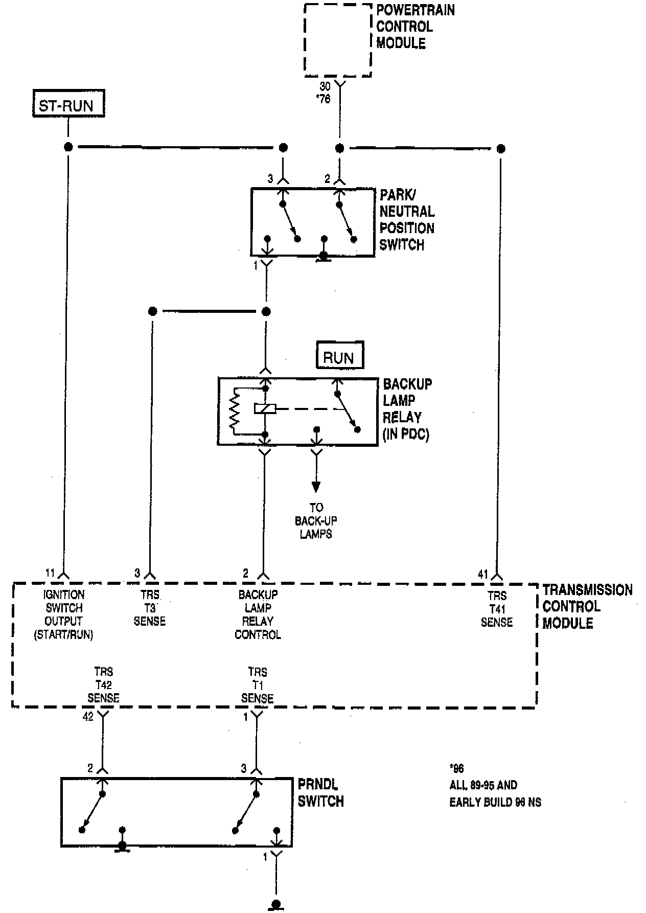 The T1, T3, T41, and T42 sense circuits communicate the shift lever position to the TCM. Each circuit is terminated at the transmission with a switch. Each switch can be either open or closed, depending on the shift lever position. The TCM can decode this information and determine the shift lever position. Each shift lever position has a certain combination of switches which will be open and closed, this is called a PRNDL code. Since there are 4 switches, there are 16 possible combinations of open and closed switches (codes). Most vehicles have only 7 gear positions and there are three recognized between gear codes, this results in 6 codes which should never occur, these are called invalid codes.