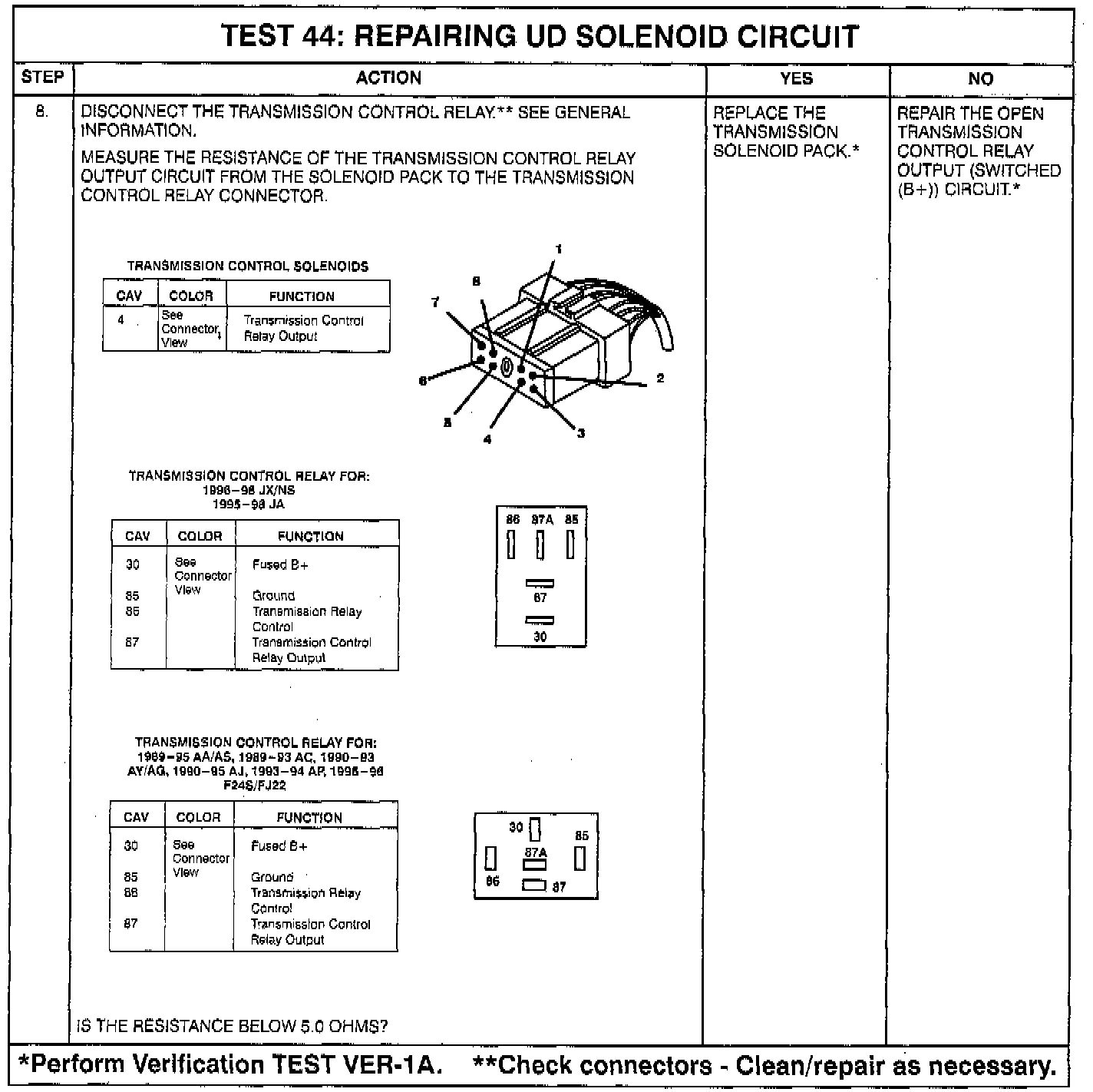 All four solenoids are tested for continuity continuously during vehicle operation. For solenoids that are currently energized, power is momentarily interrupted, then reenergized. For solenoids that are not currently energized the solenoid is momentarily energized then deenergized. Under both situations, if an inductive spike is not sensed by the Transmission Control Module (TCM) during the continuity check, it is retested again. If it fails the test four times (three times for 89-93 model years), the appropriate code is set.