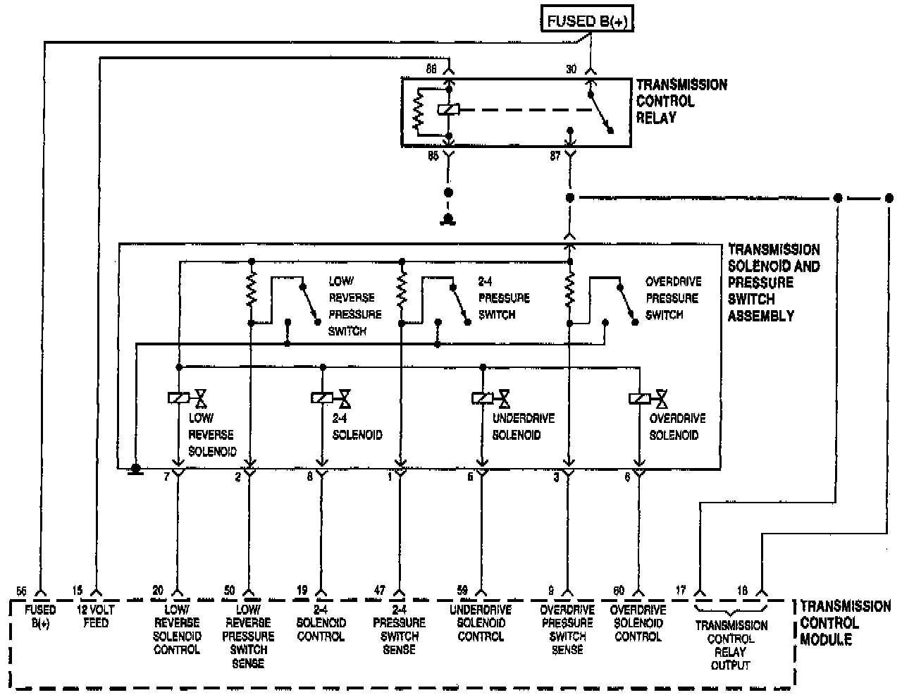 - Open or shorted solenoid circuit(s) between TCM and solenoid pack.