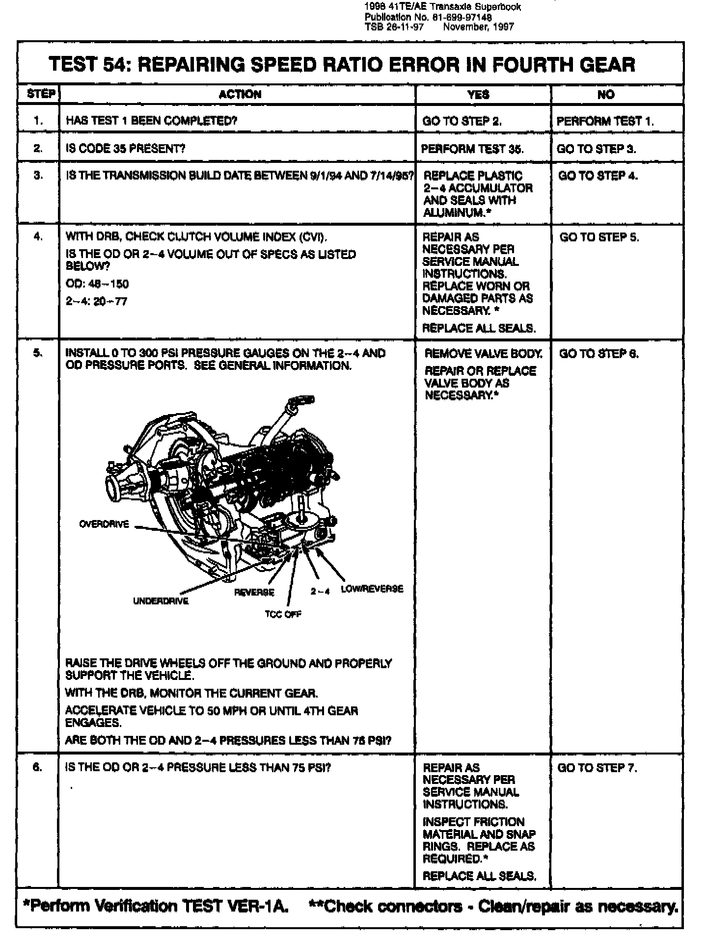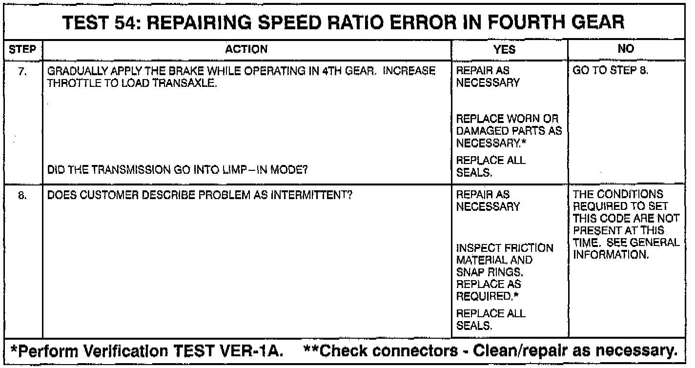 96 MY V-2 calibration (default desensitization) and 97 MY - The transmission will not go into relay open limp- in mode until three gear/speed ratio error events occur in a given key start. This allows for intermittent problems to correct themselves without opening the relay. However, if a gear/speed ratio error develops, a code is always set, but if the condition corrects itself the transmission will continue without requiring the ignition key to be cycled on and off. Many different events could occur given the range of failures possible for codes 50 through 58. The following are a few examples: