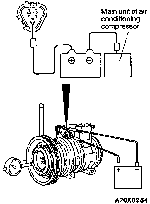Apply battery voltage to the magnetic clutch and check that the air gap is within the standard value. If the air gap is outside the standard value, adjust with a shim.
