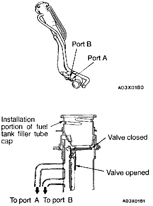 (1) Connect a clean rubber hose to the port A of the fuel tank filler tube assembly.