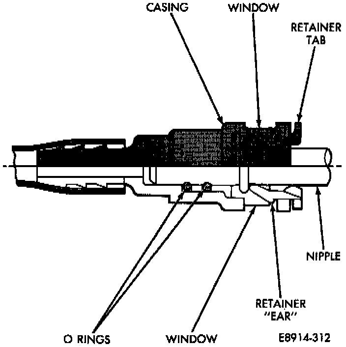 The quick-connect fitting consists of the 0-rings, retainer and casing Fig. 5. When the fuel tube enters the fitting, the retainer locks the shoulder of the nipple in place and the 0-rings seal the tube.