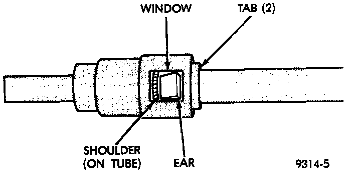 NOTE: The quick-connect fitting has windows in the sides of the casing. When the fitting completely attaches to the fuel tube, the retainer locking ears and fuel tube shoulder are visible in the windows.