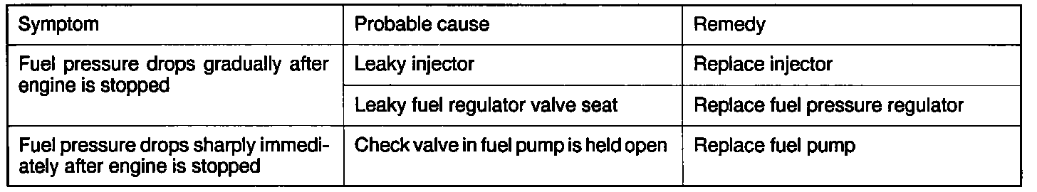 8. Turn the ignition switch off and observe fuel pressure gauge reading. Normal if the reading does not drop within 2 minutes. If it does, observe the rate of drop and troubleshoot and repair according to the table below.