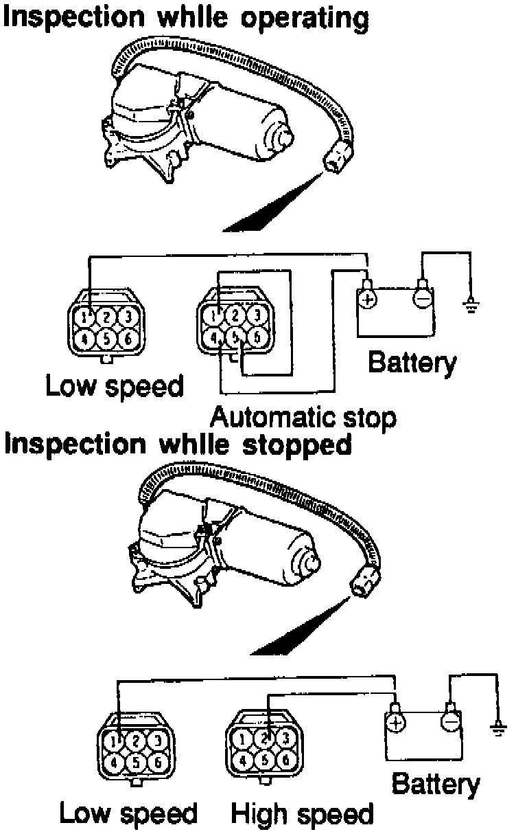 2. Connect terminals as well as battery as shown, and ensure wiper motor stops at automatically stopped position following low speed operation.