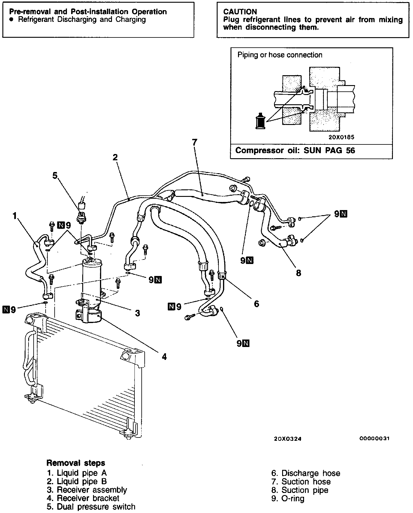 When replacing the suction hose or the receiver assembly, refill them with a specified amount of compressor oil.