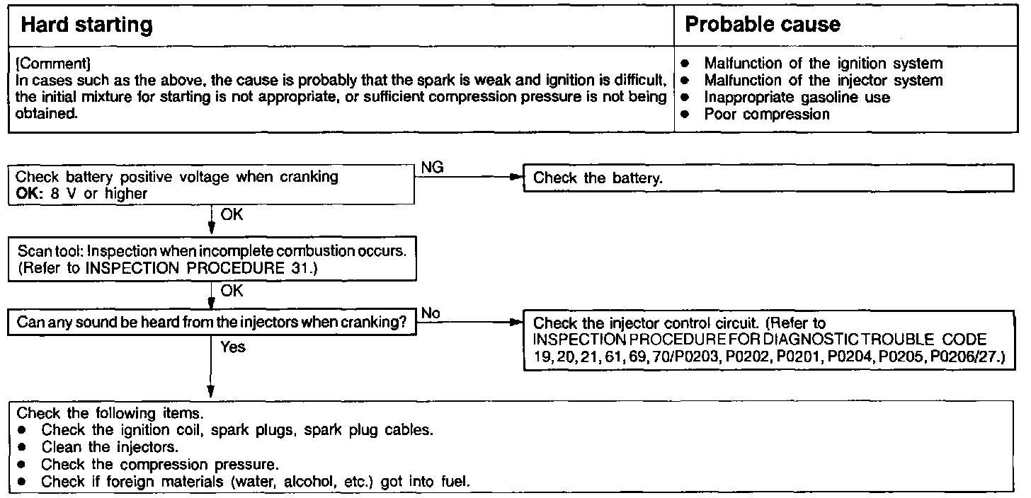 - In cases such as the above, the cause is probably that the spark is weak and ignition is difficult, the initial mixture for starting is not appropriate, or sufficient compression pressure is not being obtained.