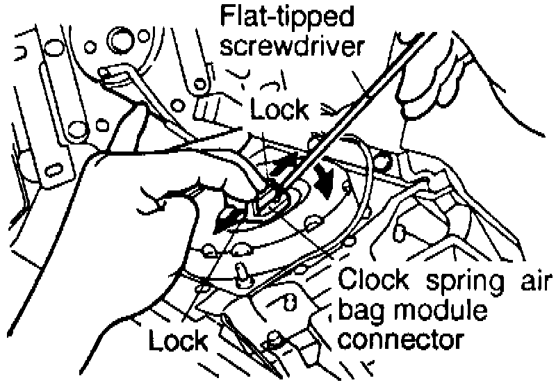 4. Turn air bag module over and press air bag lock toward outer side to spread it open, then use a flat-tipped screwdriver to gently pry apart clockspring connector.