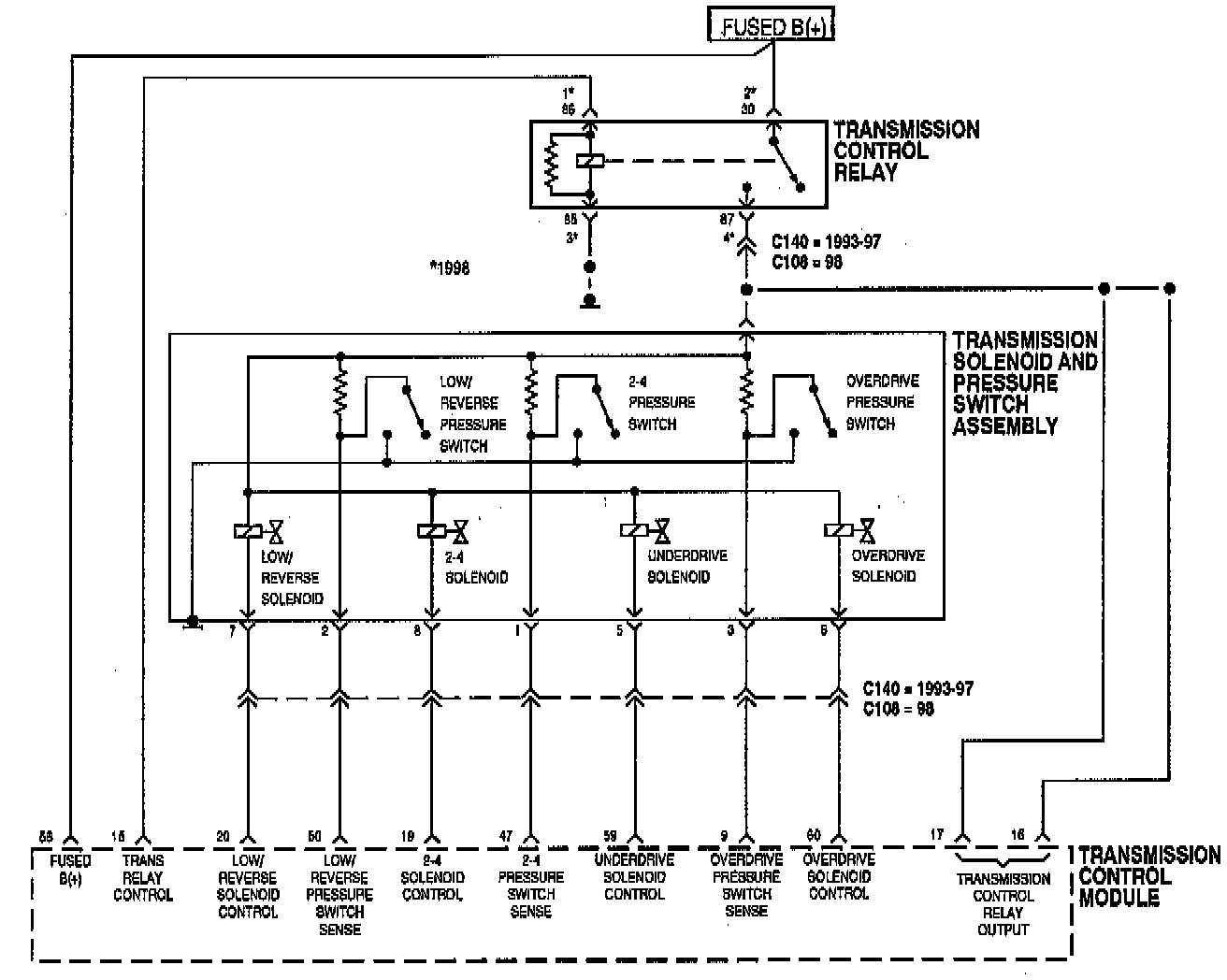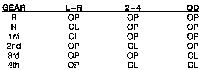 This code is set if the L-R and 2-4 and OD pressure switches are either open or closed at the wrong time in a given gear. (See chart above). This code indicates that all of the pressure switches indicated the wrong state at the time the fault was set.