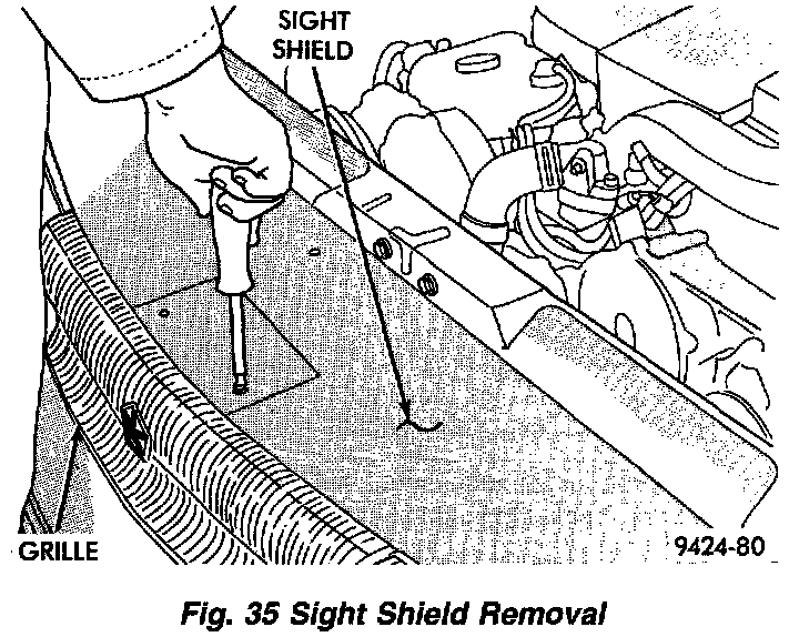 11. Remove upper radiator mounting screws to body. Access to mounting screws can be obtained through hole in headlamp module bracket.