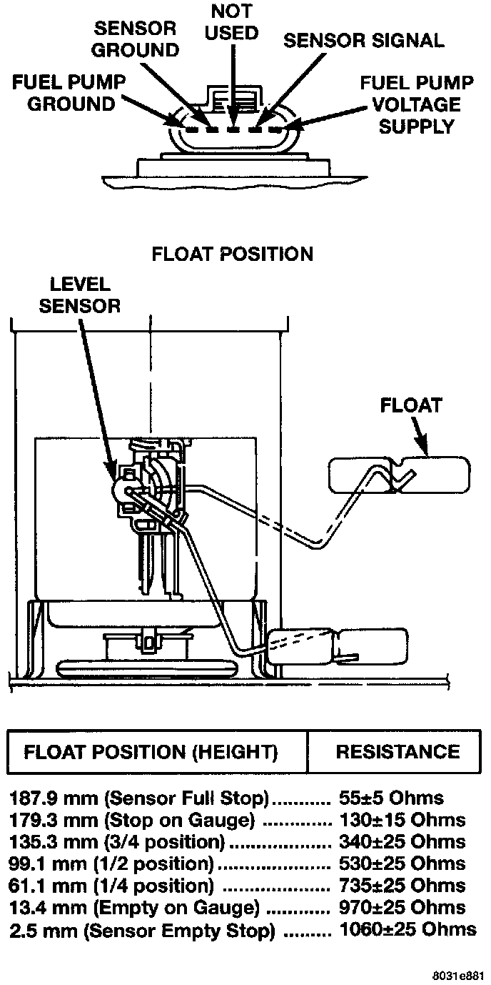 To test the level sensor connect an ohmmeter across the sensor signal and sensor ground terminals of the fuel pump module connector. Move the float lever to the positions shown in the resistance chart. Record the resistance at each point.