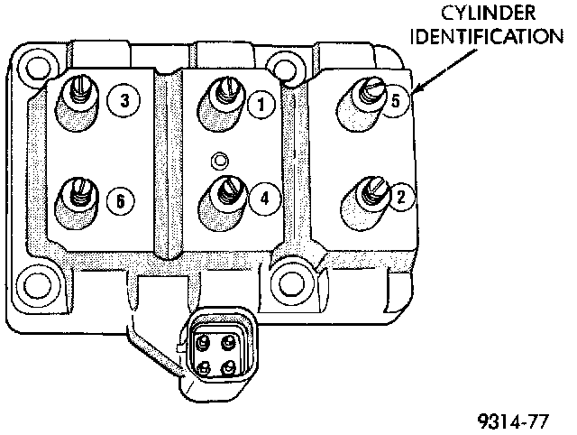 The coil assembly consists of 3 coil molded together (Fig. 32). The coil assembly is connected on the intake manifold. High tension leads rotate to each cylinder from the coil. The coil fires two spark plugs every power stroke. One plug is the cylinder under compression, the other cylinder fires on the exhaust stroke. The PCM determines which of the coils to charge and fire at the correct time.