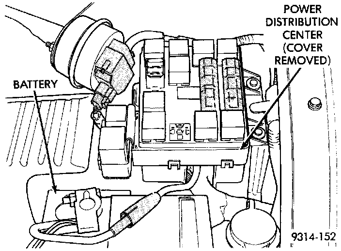 The power distribution center (PDC) is located next to the battery (Fig. 1). The PDC contains the starter relay, radiator fan relay, A/C compressor clutch relay. auto shutdown relay, fuel pump relay and several fuses.