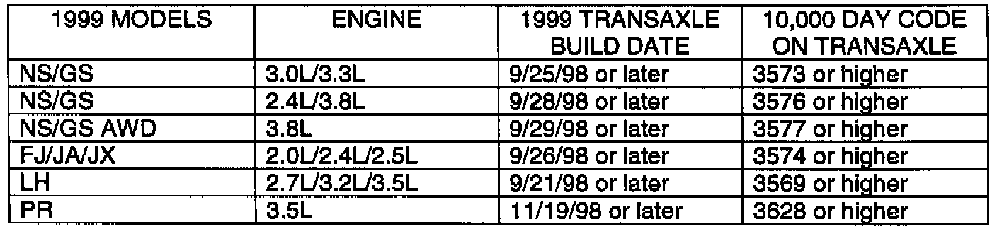 THIS INFORMATION APPLIES TO VEHICLES EQUIPPED WITH A 41TE OR 42LE TRANSAXLE. THE FOLLOWING TABLE LISTS THE BUILD DATE (BY MODEL) FOR THE TRANSAXLES THAT INCLUDE THE NEW TRS.