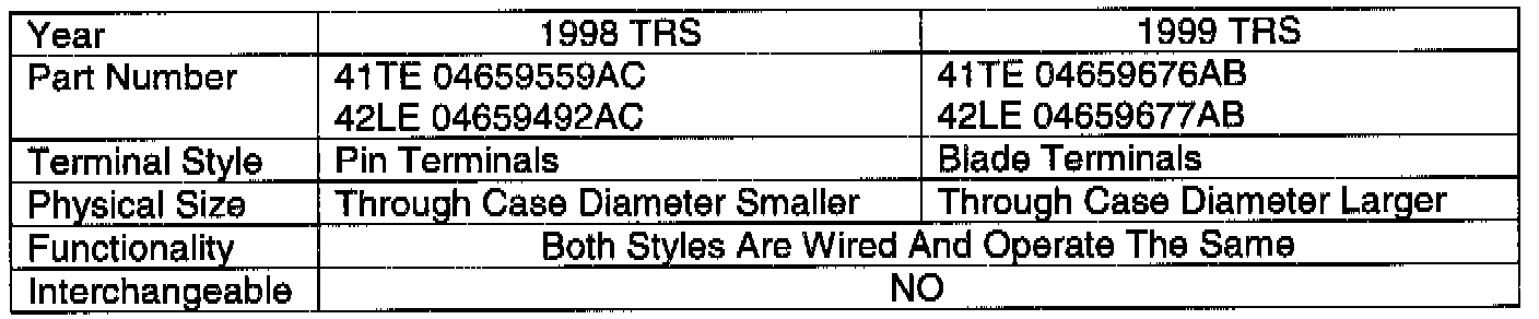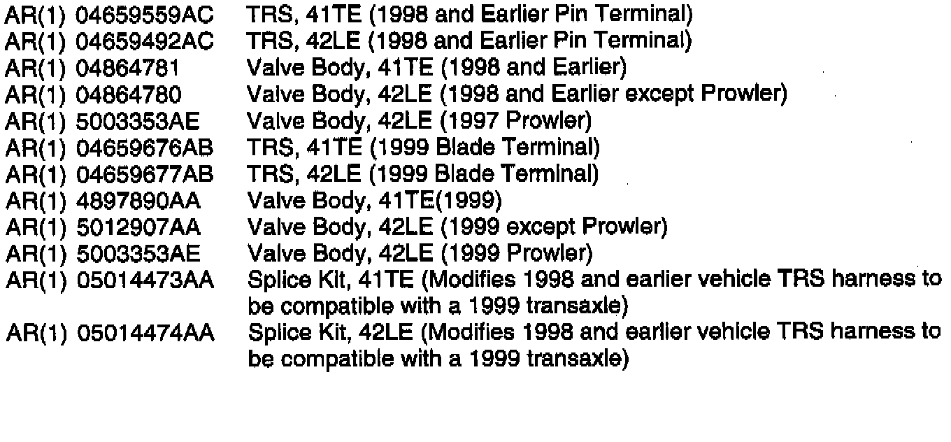 ^ If a 1999 model transaxle is received for a 1998 or earlier vehicle, a TRS harness splice kit p/n 5014473AA 41TE or 5014474AA 42LE must be ordered to modify the vehicle harness.