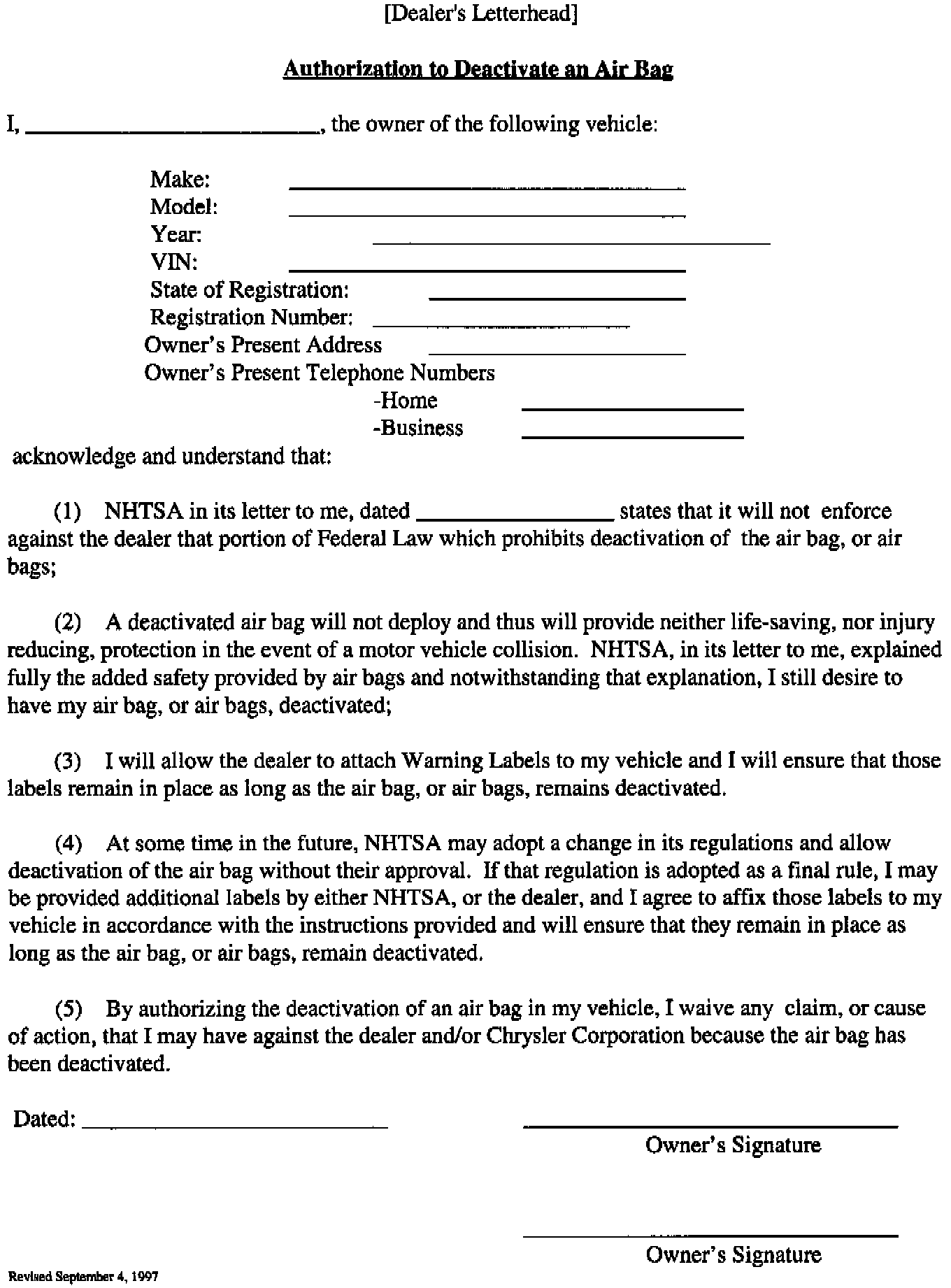 1. THE OWNERS MUST: produce a letter from NHTSA authorizing deactivation; verify vehicle ownership; and sign a copy of the waiver (reproduced on the Dealer's letterhead) provided with this bulletin.