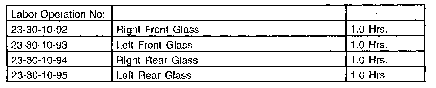URETHANE SHOULD SET FOR 1 HOUR BEFORE HANDLING/INSTALLING THE GLASS. THE REMAINING CURE TIME CAN BE ACHIEVED IF THE WINDOW IS INSTALLED AND LOCKED IN THE UP POSITION FOR THE SPECIFIED TIME. THIS WILL ALLOW THE VEHICLE TO BE RETURNED TO THE CUSTOMER WITH THE WINDOW HANDLE OR SWITCH TAPED TO PREVENT USE.