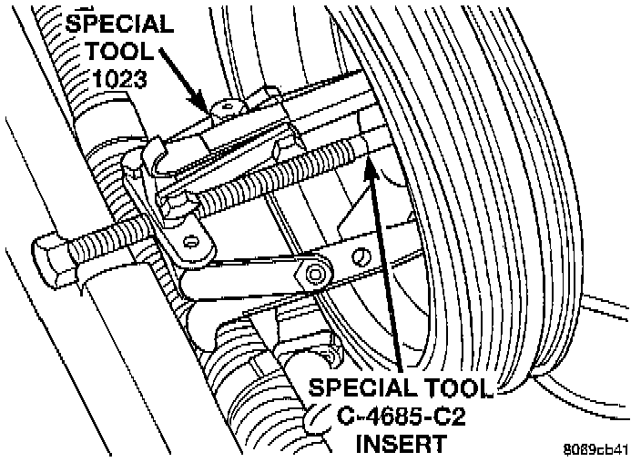 6. Use Special Tool 1023 puller, and insert C-4685-C2, or equivalents, remove crankshaft damper.