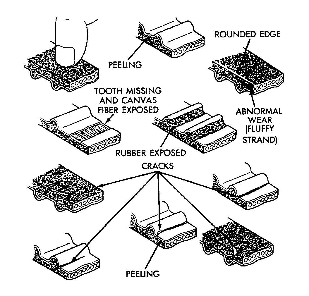 ^ Abnormal wear of belt sides. The sides are normal if they are sharp as if cut by a knife.