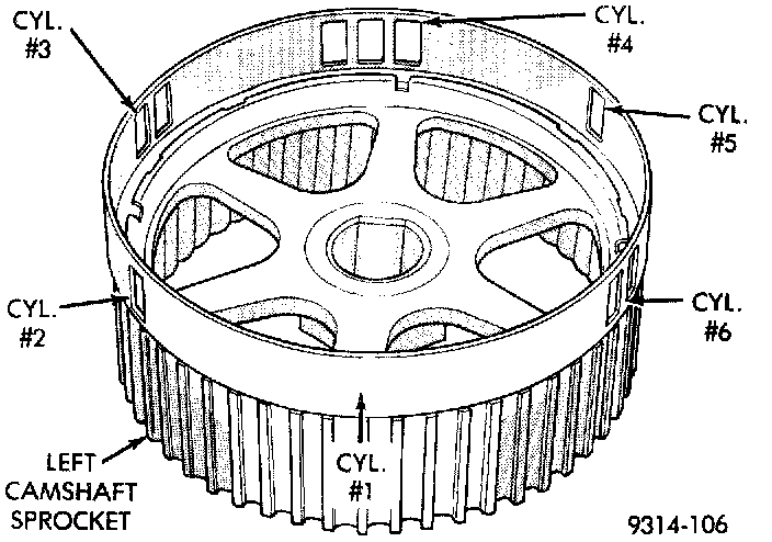 When the PCM receives two cam pulses followed by the long flat spot on the camshaft sprocket, it knows that the crankshaft timing marks for cylinder one are next (on driveplate). When the PCM receives one camshaft pulse after the long flat spot on the sprocket, cylinder number two crankshaft timing marks are next. After 3 camshaft pulses, the PCM knows cylinder four crankshaft timing marks follow. One camshaft pulse after the three pulses indicates cylinder five. The two camshaft pulses after cylinder 5 signals cylinder six (Fig. 5) or (Fig. 6). The PCM can synchronize on cylinders 1 or 4.