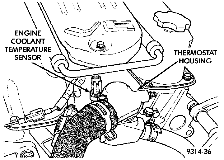 The engine coolant temperature sensor threads into the water jacket next to thermostat housing (Fig. 12). The sensor provides an input to the powertrain control module (PCM). As coolant temperature varies, the sensor resistance changes, resulting in a different input voltage to the PCM.