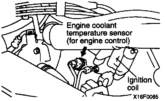 The Engine Coolant Temperature Sensor is located in the thermostat housing at the rear of the engine.