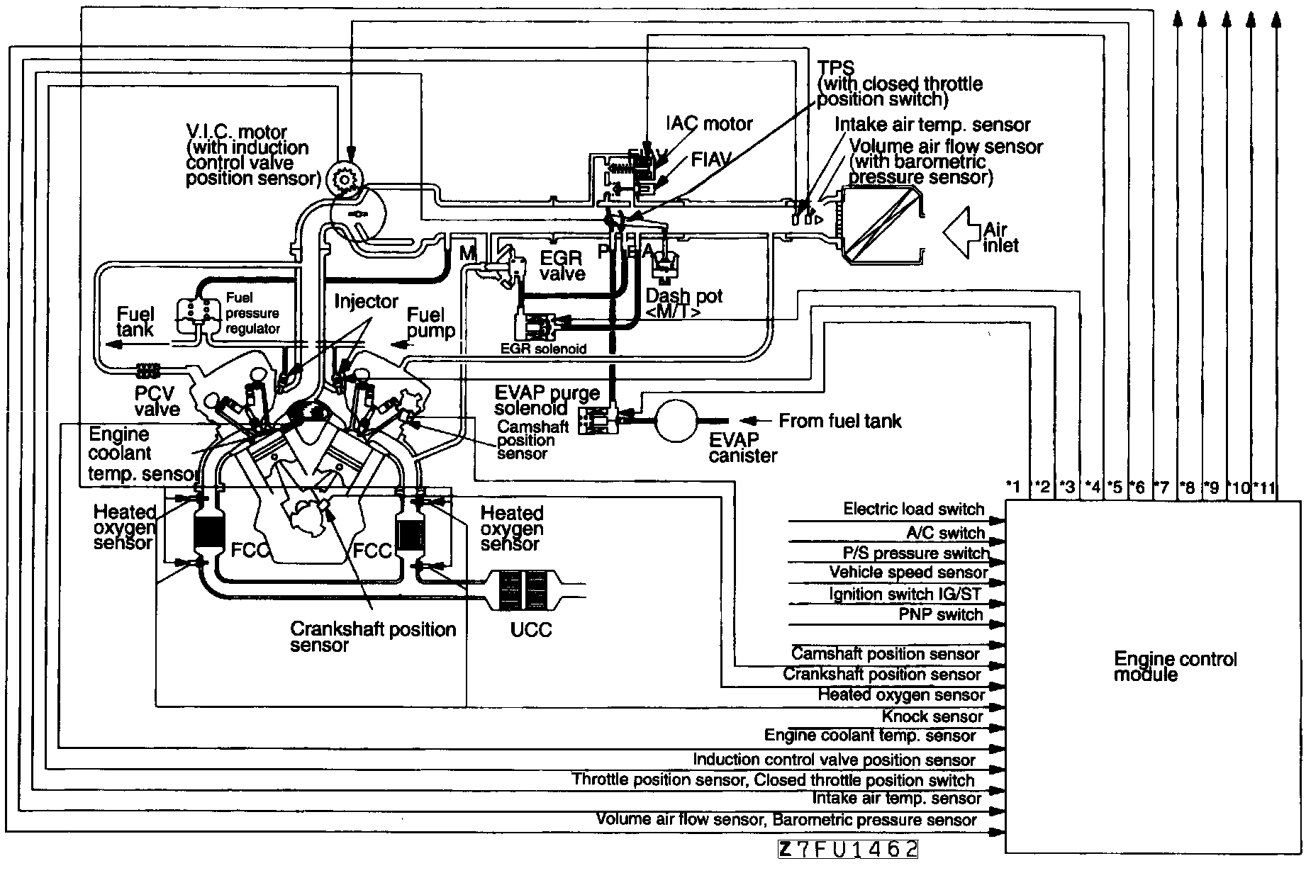The Electronically Controlled Multipoint Injection system (ECI-MULTI)maintains emission levels and fuel economy within government agency standards, while optimizing driveability. The system consists of an Engine Control Module (ECM), Control Relay, wiring, sensors and actuators.