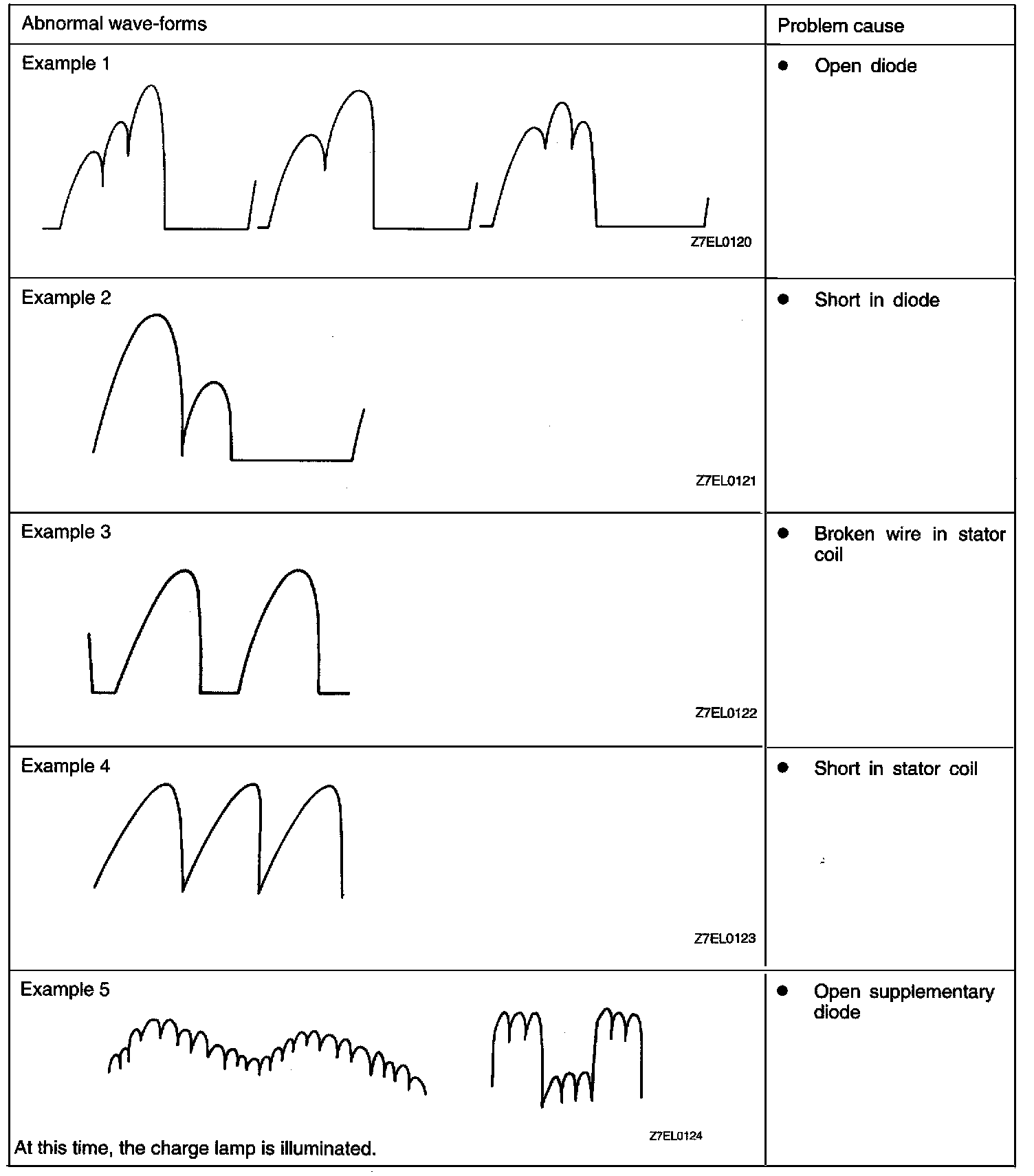 2. Identification of abnormal wave-forms is easier when there is a large output current (regulator is not operating). (Wave-forms can be observed when the headlamps are illuminated.)