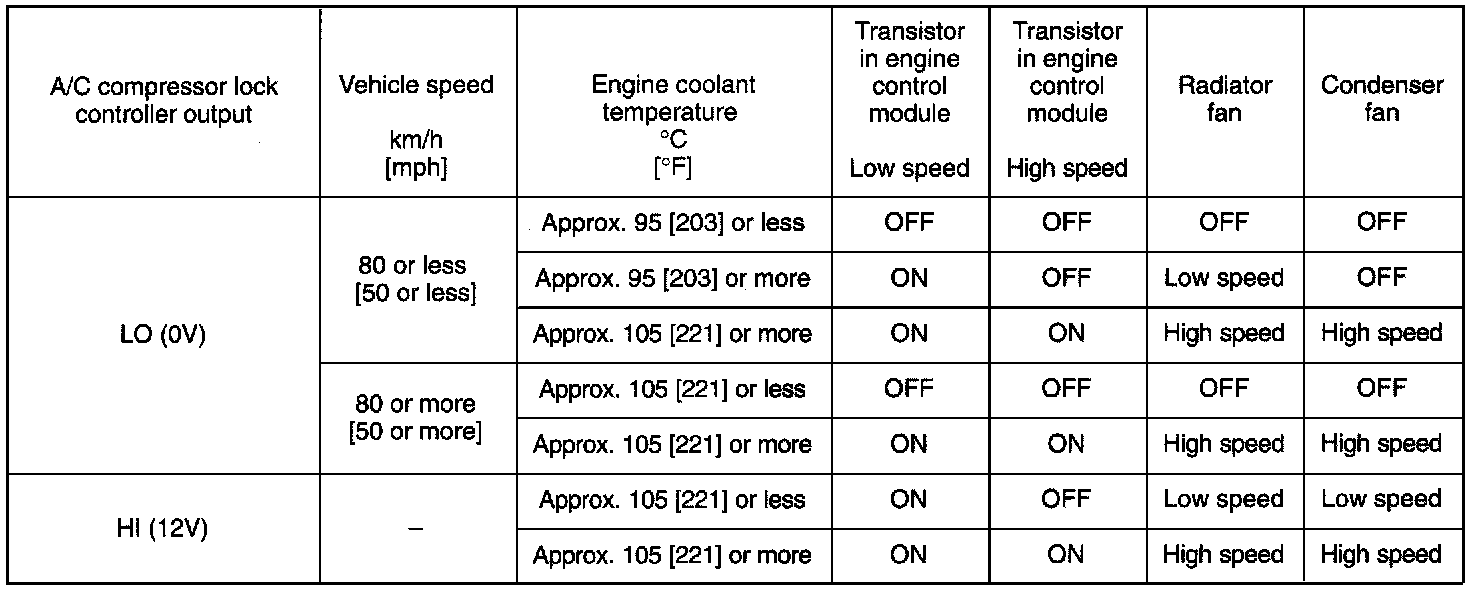 - The power from the A/C compressor lock controller turns on the condenser fan motor relay (LO) to rotate the condenser fan at low speeds.