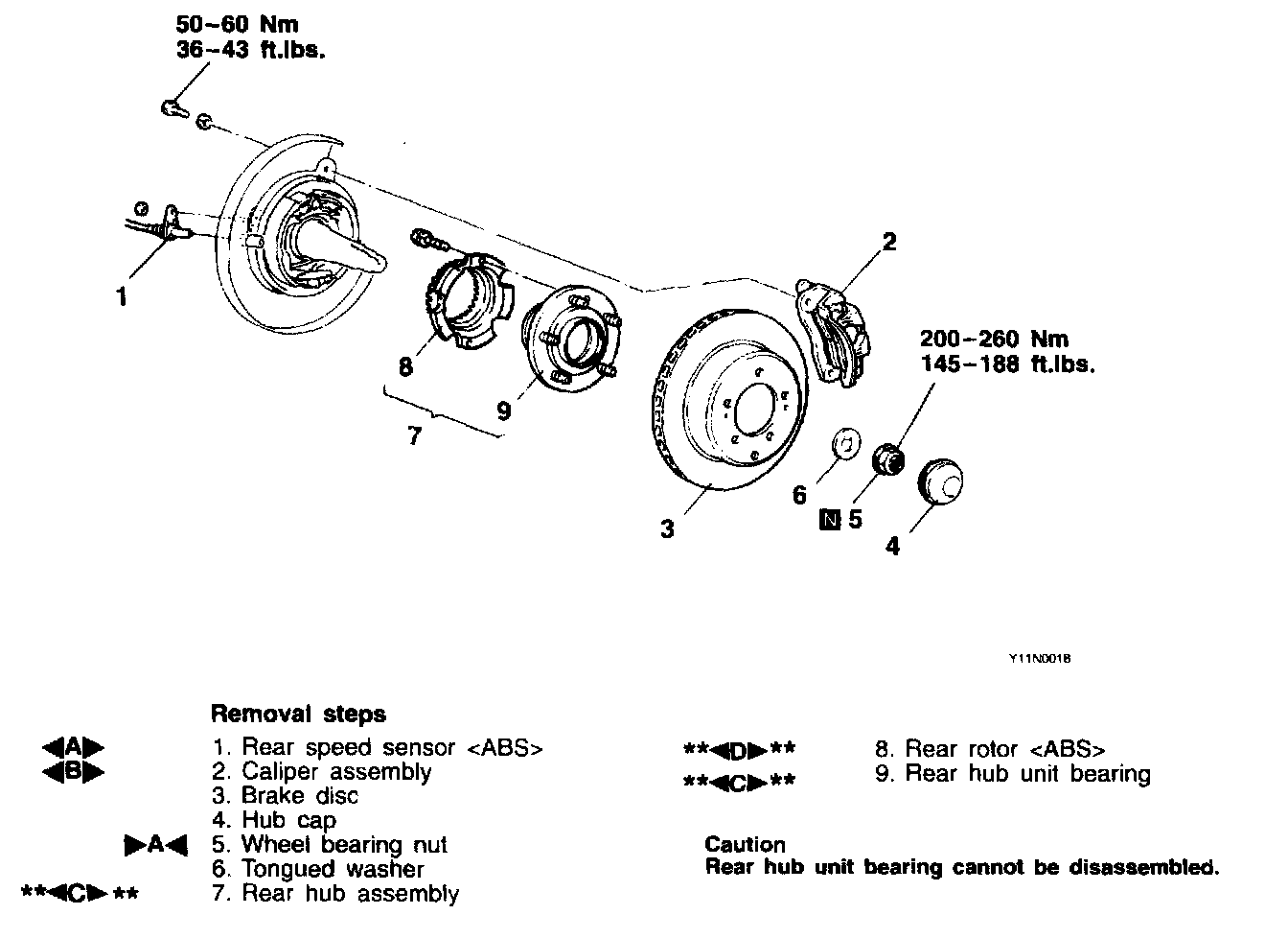 1. Remove rear hub and bearing assembly as shown, noting the following:
