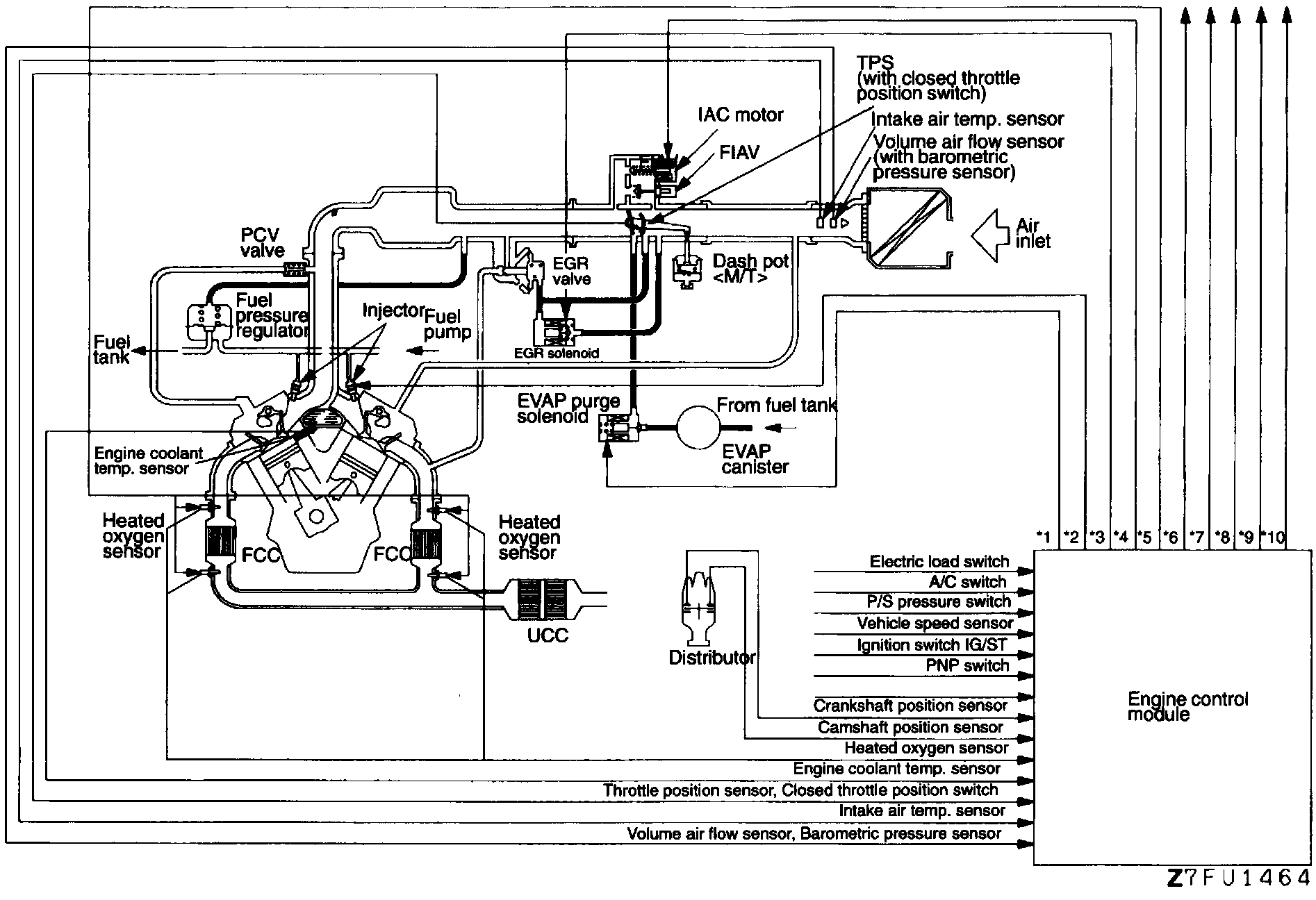 The Mitsubishi electronically controlled multipoint injection system (ECI-MULTI) maintains emission levels and fuel economy within government agency standards, while optimizing driveability. The system consists of an Engine Control Module (ECM), control relay, wiring, sensors and actuators.