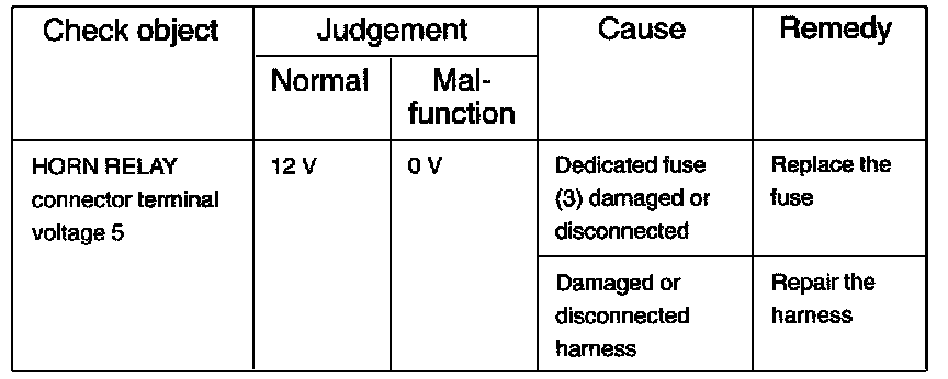 Horn Relay Power Supply Circuit Continuity Table: