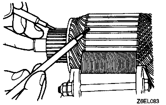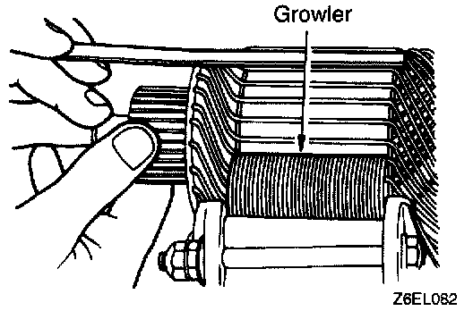 2. Hold a thin steel blade parallel and just above while rotating armature slowly in growler. A shorted armature will cause blade to vibrate and be attracted to the core. Replace shorted armature.