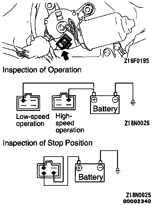 Connect the battery to the wiper motor as shown, and check its operation at LOW and HIGH speeds.