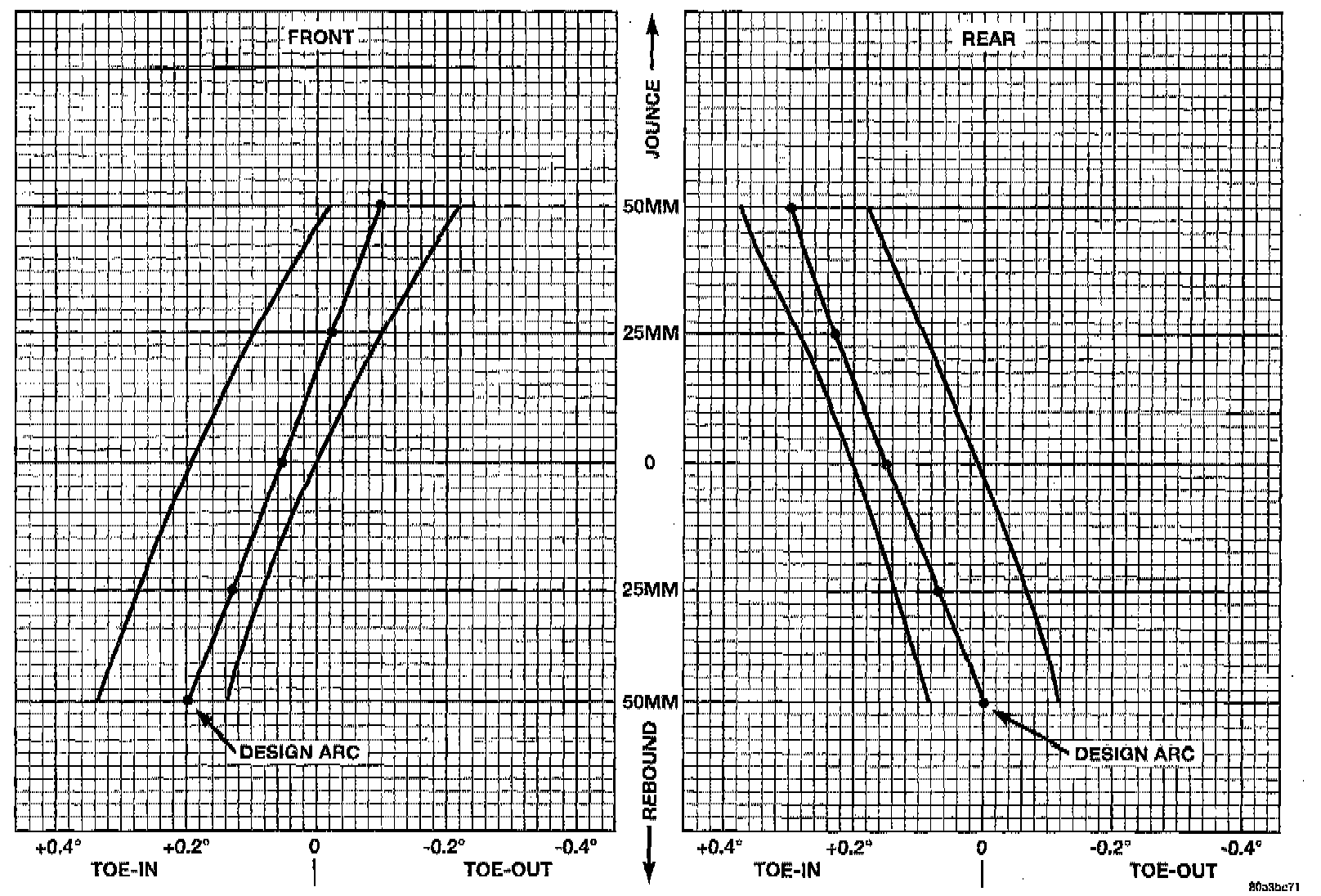 NOTE: It may not be possible to obtain a wheel toe reading with the vehicle lowered 50 mm (2 inch) below design. If not, use readings from other height settings to determine toe pattern arc.