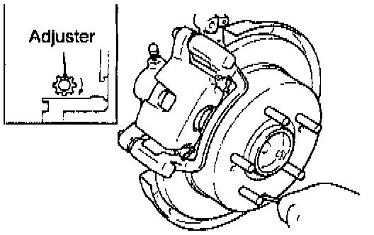 1. Remove the adjustment hole plug, and then use a flat-tip (-) screwdriver to turn the adjuster in the direction of the arrow (the direction which expands the shoe) so that the disc will not rotate.