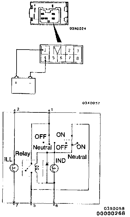 2. When the battery (+) side is connected to terminal 1 and the (-) side is connected to terminal 4, and the main switch is turned to ON, check if battery voltage is output between terminal 5 and the ground until the main switch is turned to OFF.