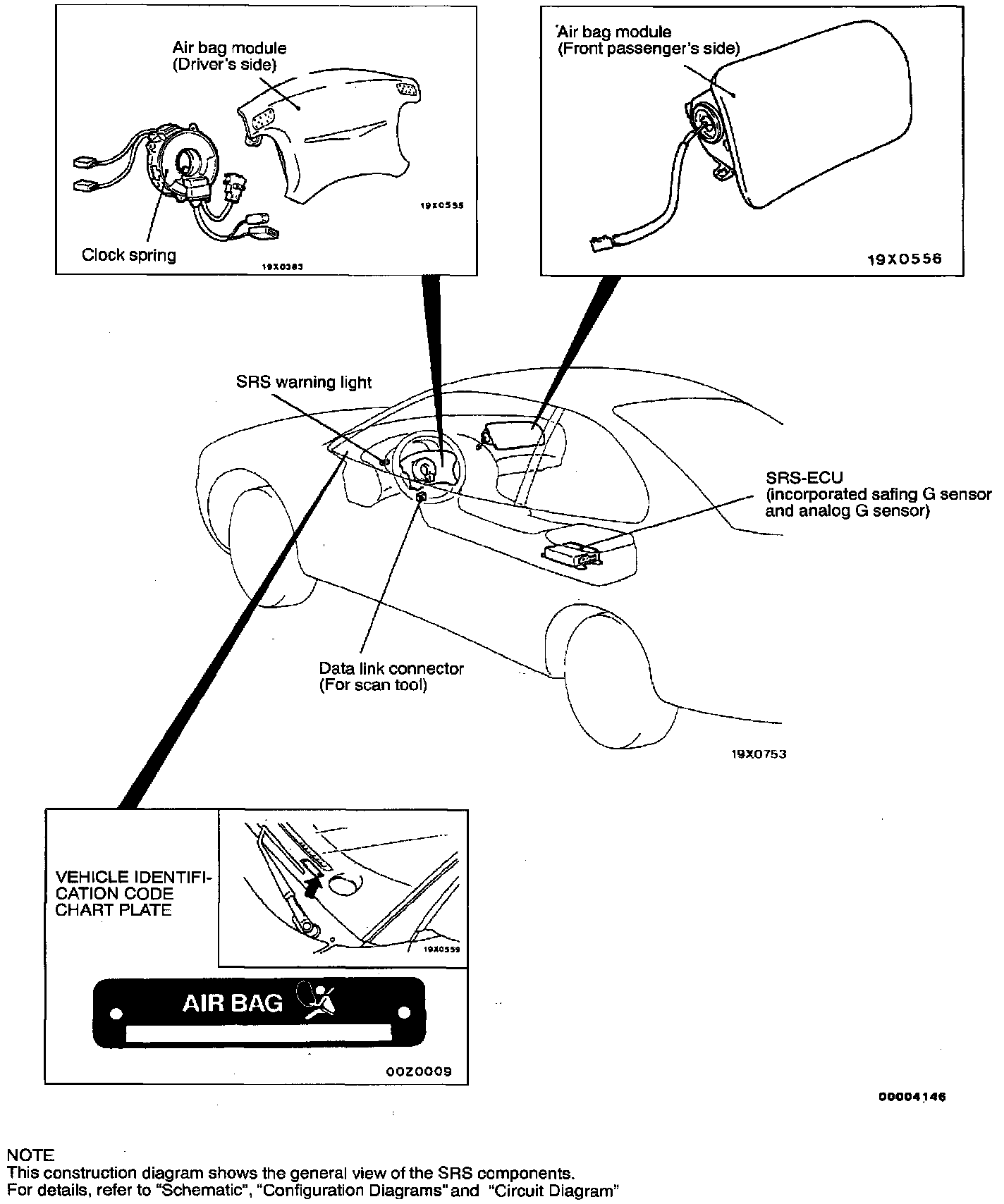 The SRS consists of: two air bag modules; one located in the center of the steering wheel and another one located above the glove box, which contains the folded air bag and an inflator unit; the SRS air bag control unit (SRS-ECU) located under the floor console assembly, which monitors the system, and which contains a safing G sensor and analog G sensor; an SRS warning light located on the instrument panel, which indicates the operational status of the SRS; a clock spring interconnection located within the steering column.