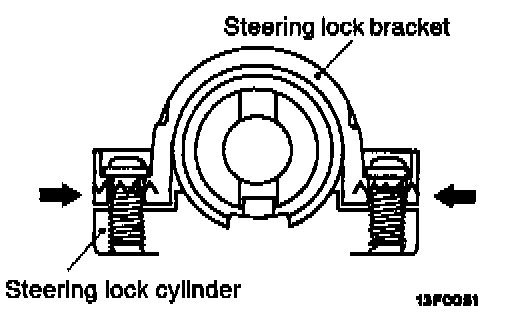 6. If it is necessary to remove the steering lock cylinder, use a hacksaw to cut the special bolts at the steering lock bracket side.