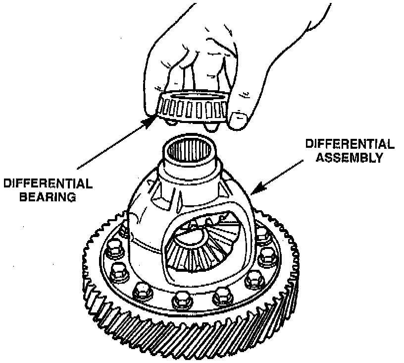 The 41TE uses a helical-type ring and pinion gear set. The ring gear is bolted to the differential case, and drives the differential case in all gear ranges. The differential case assembly consists of the differential case and within it, two pinion gears, two side gears and a pinion mate shaft retained with a roll pin. The differential case provides input power from the ring gear to the axle shafts through the case, pinion shaft, pinion gears and side gears. The pinion and side gears allow the right and left axles to rotate at different speeds while the vehicle is cornering.
