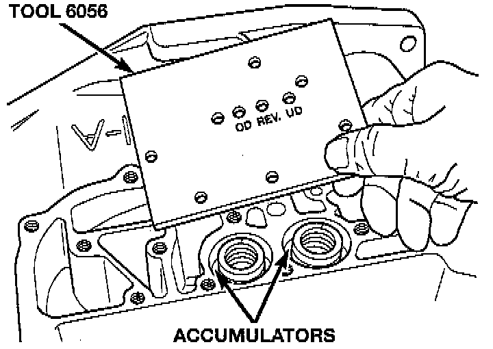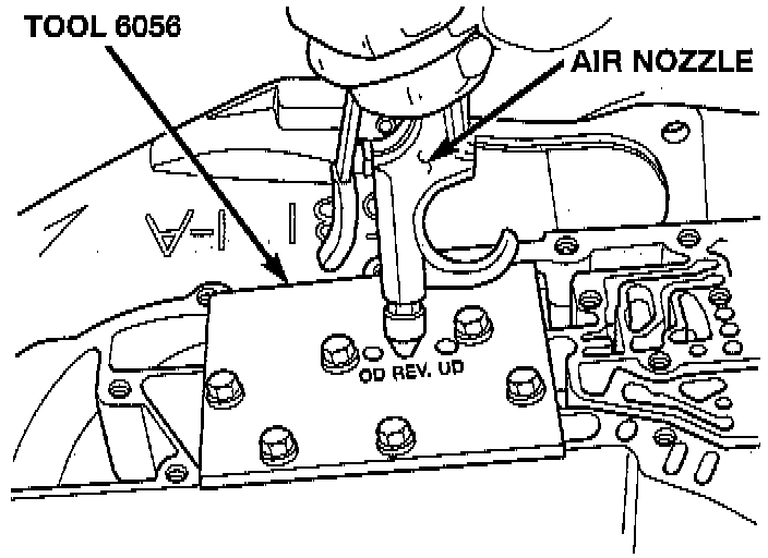 Inoperative clutches can be located using a series of tests by substituting air pressure for fluid pressure. The clutches may be tested by applying air pressure to their respective passages. The valve body must be removed and Tool 6056, or equivalent installed. To make air pressure tests, proceed as follows: