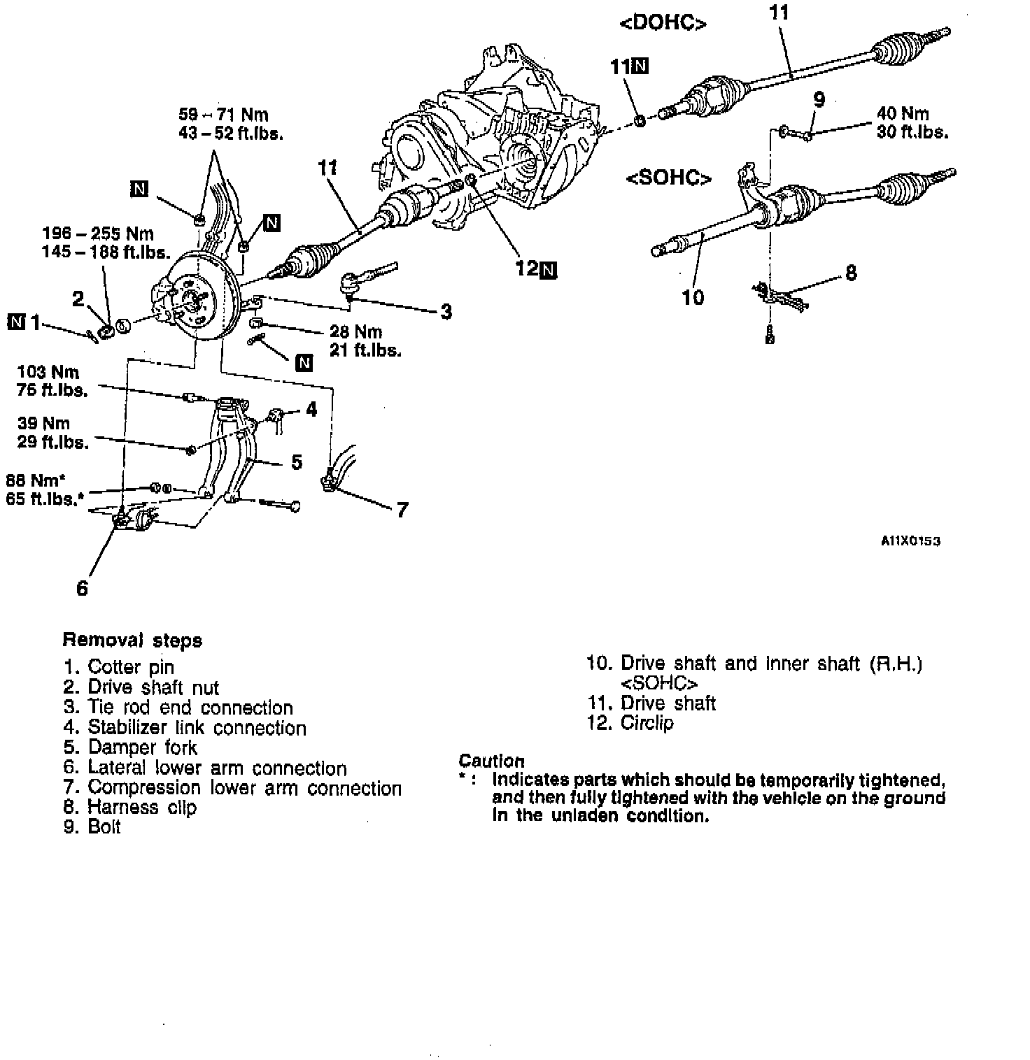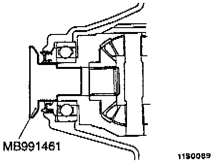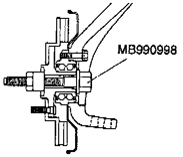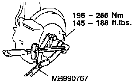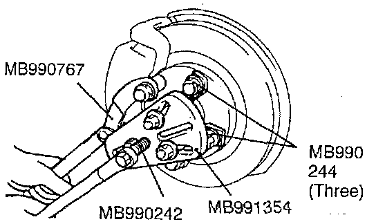 CAUTIONS: Do not apply the vehicle weight to the wheel bearing while loosening the drive shaft nut. If, however, the vehicle weight must be applied to the bearing (in order to move the vehicle), temporarily secure the wheel bearing by using the special tool, MB990998, etc.