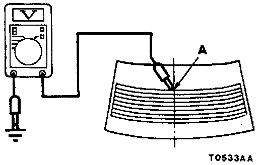 2. Turn ON rear window defogger switch. Measure heater element voltage with voltmeter at rear window glass center A.